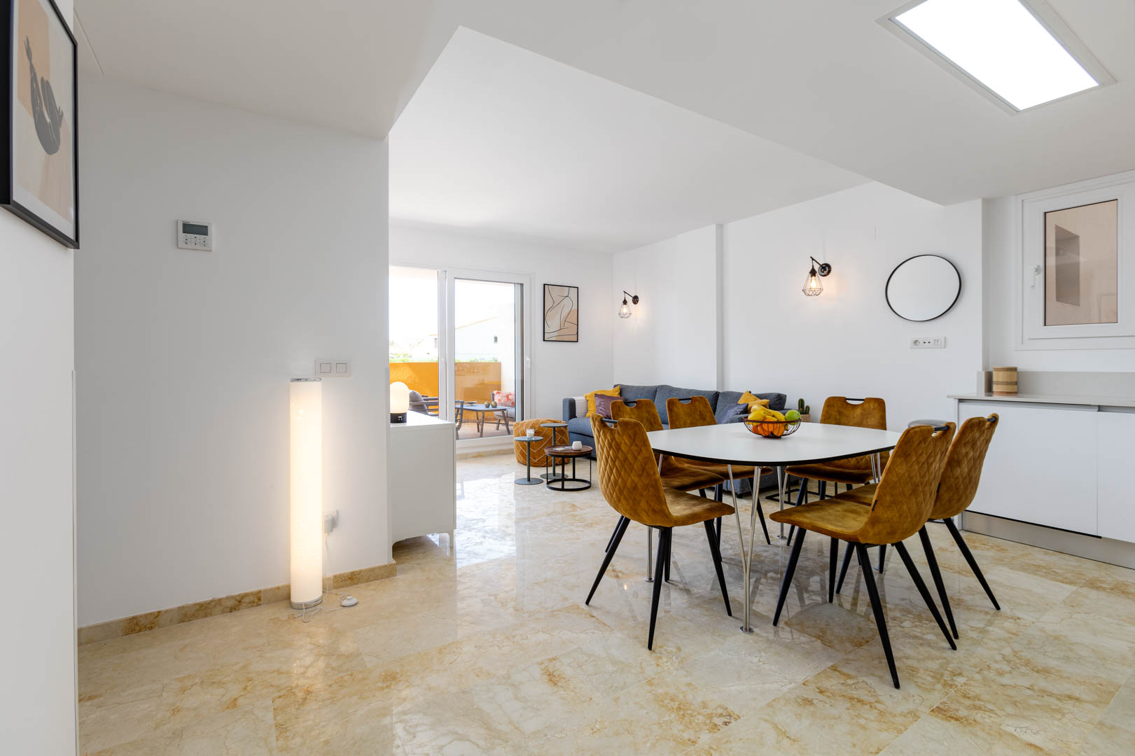 This spacious and modern apartment is located on the ground floor on the south-west in La Recoleta park, Punta Prima. From your spacious semi-covered terrace of 25 m2, you have a view over the street and a little sea view at 150 meters. The terrace is fully furnished with a luxurious lounge set, a table with 6 chairs and sun beds. Because the balcony is located on the south-west, you can spend the winter here with lots of sun on the balcony. The apartment in La Recoleta is equipped with air conditioning/heater, a spacious living room with IP smart TV and all international channels and WiFi, open kitchen with plenty of cupboard space and all built-in appliances. The apartment has 3 bedrooms with large fitted wardrobes and 2 bathrooms with underfloor heating, 1 with a bathtub. From your own parking space under La Recoleta in the garage, you have easy access to the elevator and the apartment. There are 4 child-friendly swimming pools in the sub-tropical park and you are on the beach within 2 minutes.
