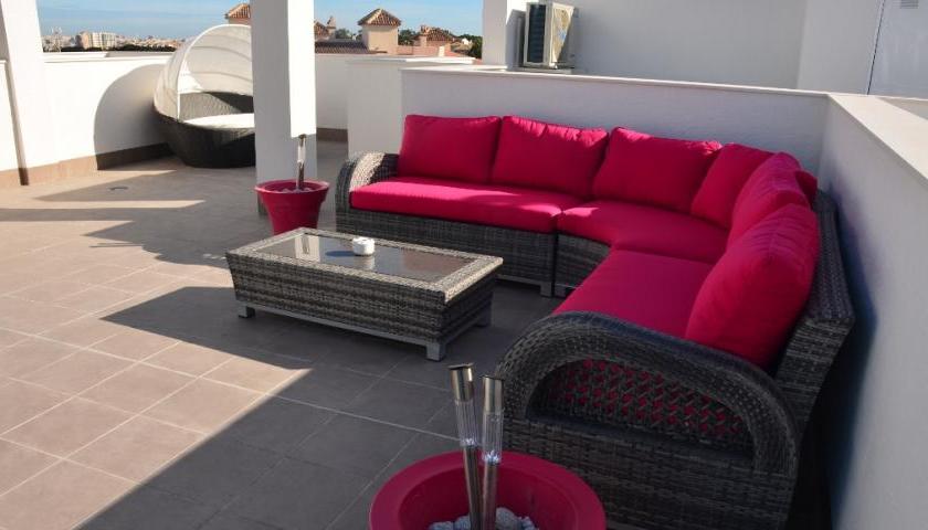 This lovely top apartment in Oasis Beach 7 Punta Prima, is equipped with all the comfort you need for a pleasant stay. This house has a spacious living room with a sofa bed, 2 bedrooms with 1 x 2 bed and 2 x 1 beds and two bathrooms with 2 x shower facility. The kitchen is fully equipped and also includes a dishwasher. The living room has air-conditioning, hot and cold, satellite TV with international channels and WIFI. The apartment is completely finished with the best materials and in accordance with the new European standards and is very well insulated. There is a balcony and a spacious fully furnished roof terrace of 55 sqm with a table and chairs, a lounge and two sun loungers. From here you have a nice view towards the sea, the communal garden and pool. The complex is safe and secure and there is underground parking. This is definitely a great place to be and in a very central and nice location. Ideal for a short stay during your vacation and long-term stays in winter with proper facilities and all day sun on the terrace.
