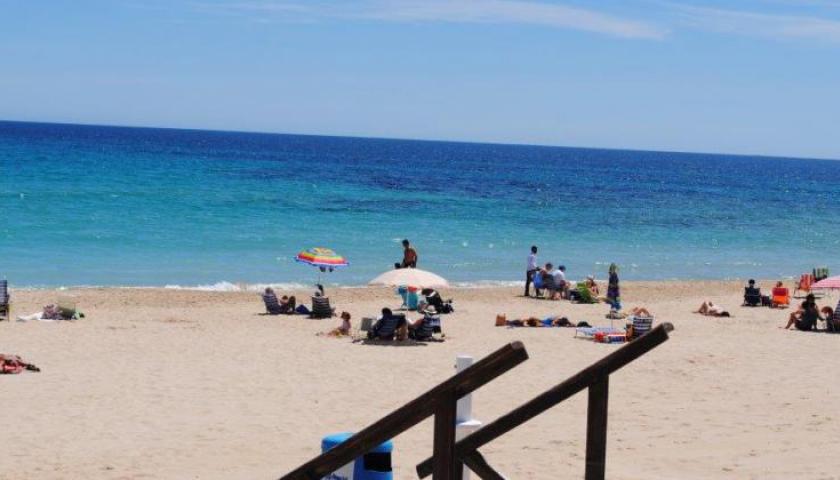 Playa De Aguamarina, dat onderdeel is van Playa De La Glea en het minst groot van Campoamor. Het is het enige strand in deze urbanisatie zonder Blauwe Vlag.